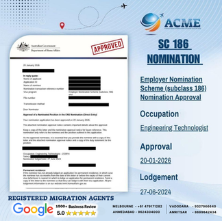 Excellent news! We have received a Nomination Approval under the Employer Nomination Scheme (subclass 186) – Direct Entry stream.